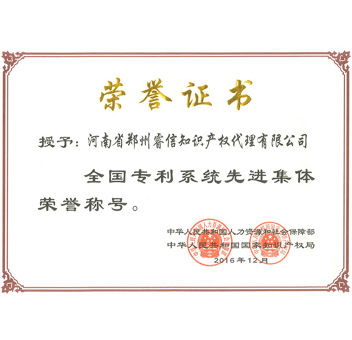 鄭州睿信被評為河南省中介服務品牌龍頭標桿型企業,名列省百家品牌企業(機構)第2名。